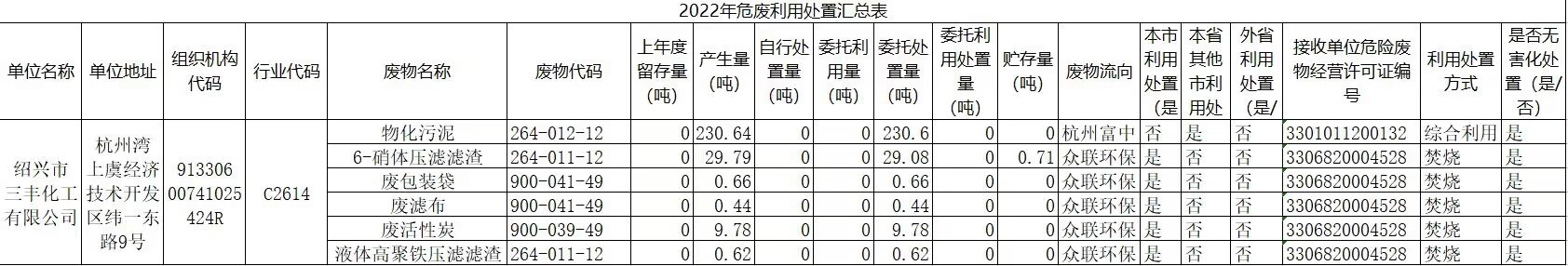 紹興市三豐化工有限公司2022年危險廢物處置利用匯總表